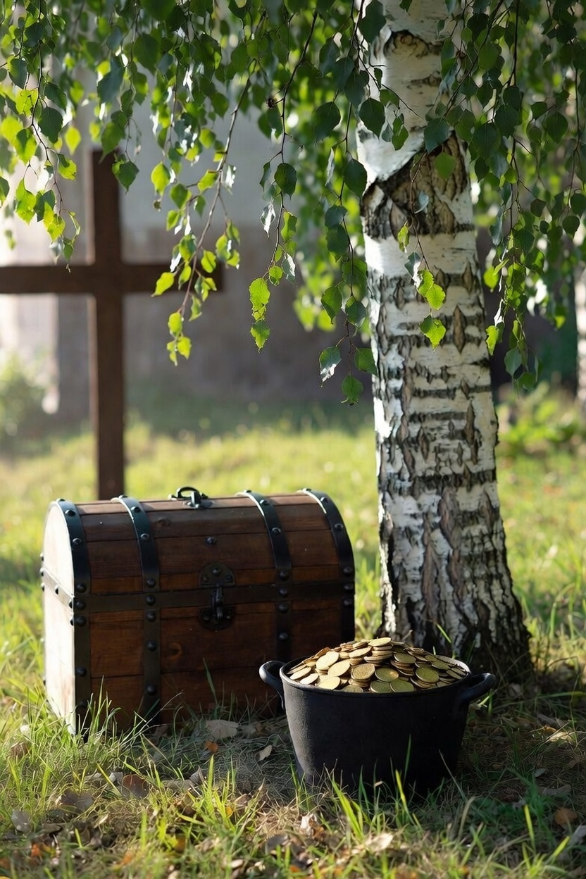 На березе в горе примета - врублено распятие. Еще с мари на большую дорогу смотри ограда. В этой ограде стоит могила. На могиле - ракитов куст. От могилы к дороге стоит крест. Здесь на поларшина врыт чугун казны.