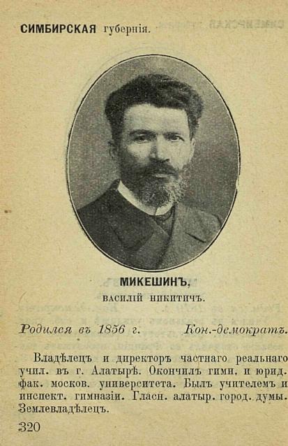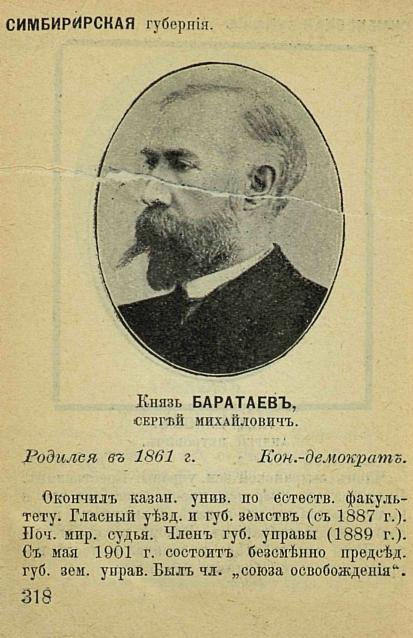 Еще одним кадетом был князь Сергей Баратаев — родившийся в Симбирске потомок знатного княжеского рода. Он отучился в Симбирской классической гимназии, затем окончил с золотой медалью за работу по органической химии и со званием кандидата естественный факультет Казанского университета. Долгое время был гласным уездного и губернского земств. После революции оставался в Симбирске, где проживал до своей смерти в январе 1930 года возглавлял местное общество взаимного кредита. Во фракцию кадетов входили также дворяне Иван Пустошкин и Василий Микешин, избранные от курии землевладельцев. Оба были уроженцами Алатырского уезда. И после расформирования Думы они безуспешно пробовали избраться в следующие созывы законодательного органа.