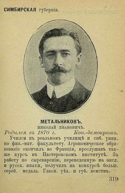 Главным кадетом Симбирской губернии был Николай Метальников. Он родился в селе Кротково Сенгилеевского уезда в семье потомственного дворянина, мирового судьи. Окончил реальное училище, после чего семья переехала в Петербург. Там он отучился на естественном отделении физико-математического факультета Петербургского университета, после чего переехал в Париж, где получил агрономическое образование в Научно-исследовательском институте микробиологии. В своем имении в Ардатовском уезде Симбирской губернии создал научно-исследовательскую лабораторию и образцовую молочную ферму. После революции перебрался в Париж и работал в Пастеровском Институте.