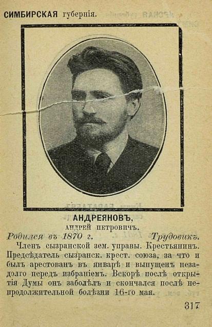 К трудовикам, избранным из крестьянской курии относился и Андрей Андреянов, который родился в крестьянской семье, в селе Томышево Сызранского уезда. В 12 лет он окончил сельскую школу и стал работать писцом в волостном правлении, позже стал волостным писарем. В начале 1898 года был избран волостным старшиной села Томышево. Позже его избрали гласным в Сызранское уездное земское собрание. В 1905 году выступил в защиту интересов крестьян, возглавил сызранский Крестьянский союз, за что был отстранён от должности и арестован в январе 1906 года. Впрочем, через несколько месяцев из-за плохого самочувствия был выпущен из тюрьмы на поруки, но сразу же принял решение участвовать в избирательной кампании. Не прошло и пары недель после избрания в Думу, как он скончался от сердечного приступа. Поговаривали, что он не пережил обвинения в сговоре с депутатом Ерогиным, опубликованном в газете «Сызрань».