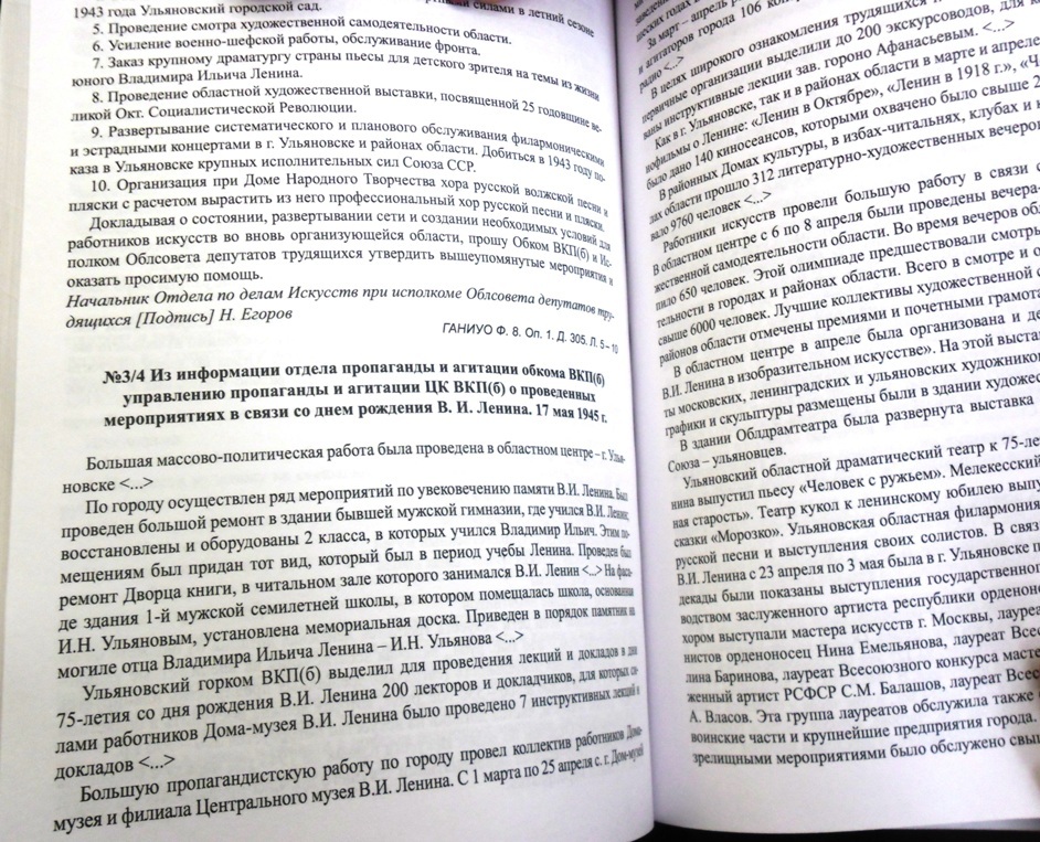 А теперь почитаем несколько документов из этого интереснейшего издания.«Из переписки с министерствами и ведомствами СССР и РСФСР по вопросам культуры, строительства и развития промышленности 16 мая 1967 г. Министру культуры РСФСР товарищу Кузнецову Н.А. О подготовке сценариев массовых представлений в Ульяновске к 100-летию со дня рождения В.И. Ленина